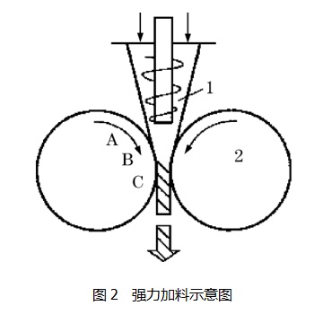 采用強(qiáng)力加料對(duì)組份多、比重相差大的錳粉礦壓制球團(tuán)比較合適。強(qiáng)力加料除有加料作用外, 還對(duì)物料有預(yù)壓作用, 破壞物料的“達(dá)橋效應(yīng)”, 排除物料中的部分氣體, 如圖所示, 物料在A 處填滿球窩, 在 B、C 處由于螺旋的作用物料只能強(qiáng)迫地留在球窩內(nèi),隨著對(duì)輥轉(zhuǎn)動(dòng)脫出球窩, 在之前始終是充滿的。