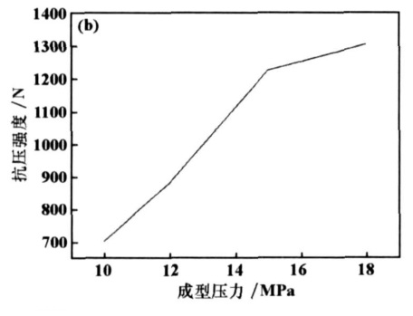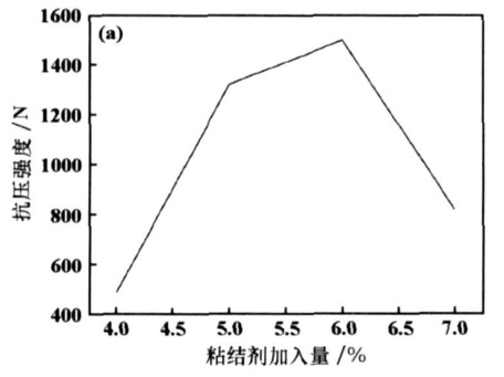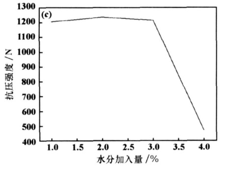 (2)粘結(jié)劑對(duì)成型后球團(tuán)抗壓強(qiáng)度的影響是先增后減,在加入 6%的糖漿時(shí),成型壓力與成型后球團(tuán)抗壓強(qiáng)度的關(guān)系是隨成型壓力的增加 ,球團(tuán)抗壓強(qiáng)度不斷增加;水分加入量不大時(shí)對(duì)球團(tuán)強(qiáng)度影響也不大, 當(dāng)含量超過 3%以后,球團(tuán)強(qiáng)度隨水分含量的增加急劇降低 。