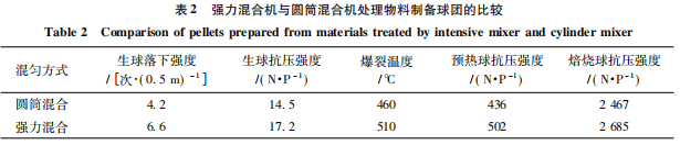分別將圓筒混合機(jī)和強(qiáng)力混合機(jī)處理的鐵精礦用于造球、預(yù)熱和焙燒,其結(jié)果比較如下表所示: 在使用強(qiáng)力混合機(jī)進(jìn)行混合后,球團(tuán)的各項(xiàng)指標(biāo)均有不同程度的提高,尤其是生球強(qiáng)度,提高的效果十分顯著,主要原因是強(qiáng)力混合機(jī)使膨潤(rùn)土在物料中分散得更加均勻,顆粒與顆粒之間黏結(jié)得更加緊密,從而提高了生球的落下強(qiáng)度和抗壓強(qiáng)度,預(yù)熱球及焙燒球抗壓強(qiáng)度分別提高 66、118 N/P。